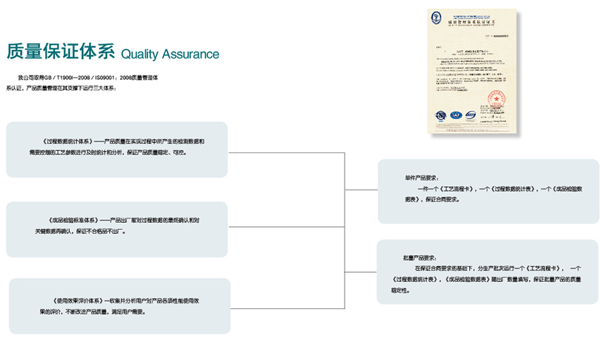 我公司取得GB/T1900I-2008/IS09001:2008質(zhì)量管理體系認(rèn)證,產(chǎn)品質(zhì)量管理在其支撐下運(yùn)行三大體系: